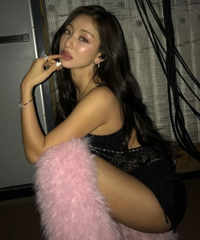 반면, 모모는 연한 핑크색의 퍼 브라톱과 함께 은은한 레오파드 패턴이 들어간 회색의 보디슈트를 입었는데요.