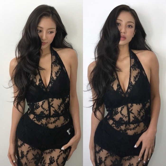 반면, 지효는 깊게 파인 네크라인과 섬세한 검정 레이스 디테일이 돋보이는 의상을 선택하여 고혹적인 매력을 뽐냈습니다.